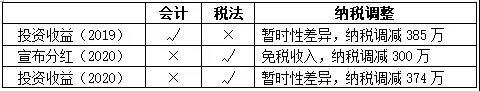 汇算清缴税务处理:2020年投资收益调减374万元;分红纳税调增300万元(暂时性差异),同时调减300万元(永久性差异)